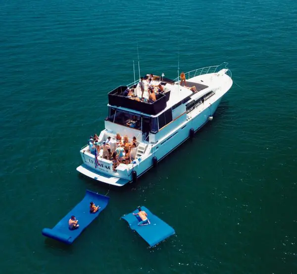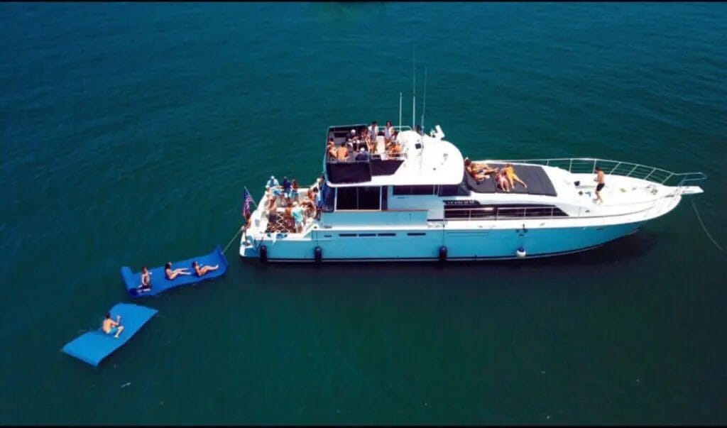 Champagne Yacht is San Diego’s only true private luxury motor yacht US coast guard certificated, licensed, and insured for up to 49 passengers. Champagne is a 75’ semi-custom Bertram motor yacht built in Florida in 1983 and completely remodeled in early 2019. Complete with a full gourmet kitchen and household-sized appliances. 2 bars. 2 guest bathrooms. 2 guests changing berths. Event-grade pro audio sound system w aux cable or DJ capabilities. 3 levels, a dance floor, DJ platform, sunbeds, and numerous lounge areas throughout. Rafts and water toys are available per request. This yacht has the entertainment space of most 100 footers.